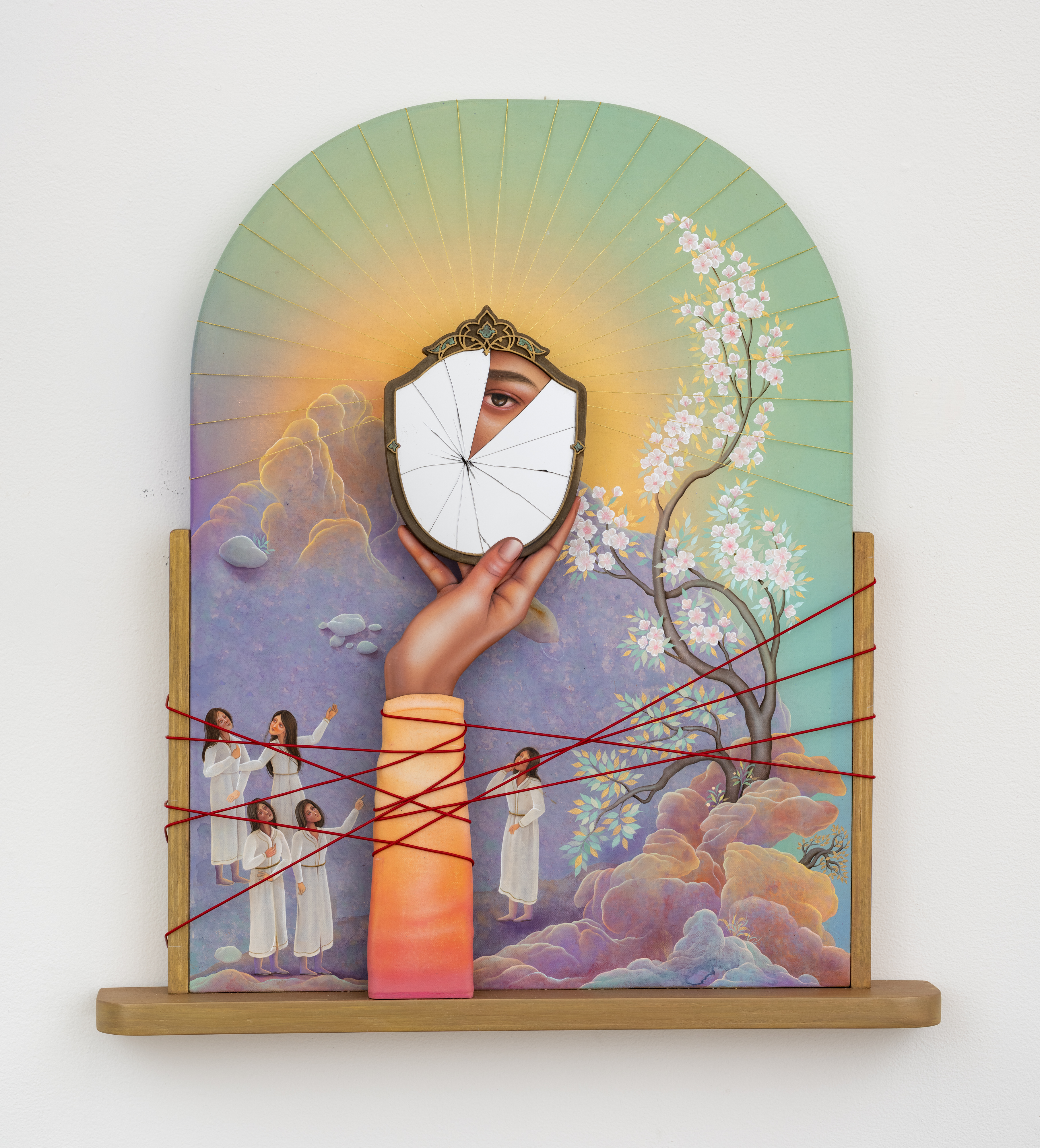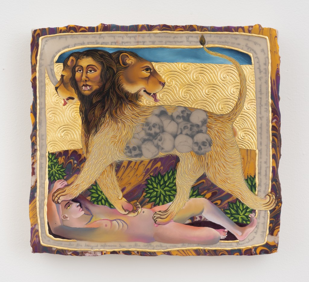 Arghavan Khosravi expands the visual language of Persian miniatures, reworking aesthetic codes to center stories of resistance, transformation, and gendered subjectivity. Traditional margins and frames are disrupted or dissolved altogether. Figures—once sidelined or veiled—emerge as central agents in surreal backdrops. Recurring motifs such as mirrors, and thread suggest paradoxical states: of captivity and freedom, fragmentation and repair, visibility and concealment. Chitra Ganesh and Sahana Ramakrishnan also borrow from classical traditions, such as Barahmasa miniature and Tanjore painting, collapsing time into nonlinear, dreamlike sequences. Drawing from myth, historical references, and explorations of the environment, their works construct palimpsests of personal cosmologies and symbolic worlds—often peopled by hybrid beings and fluid iconographies. Here, the sacred and the subconscious intertwine.