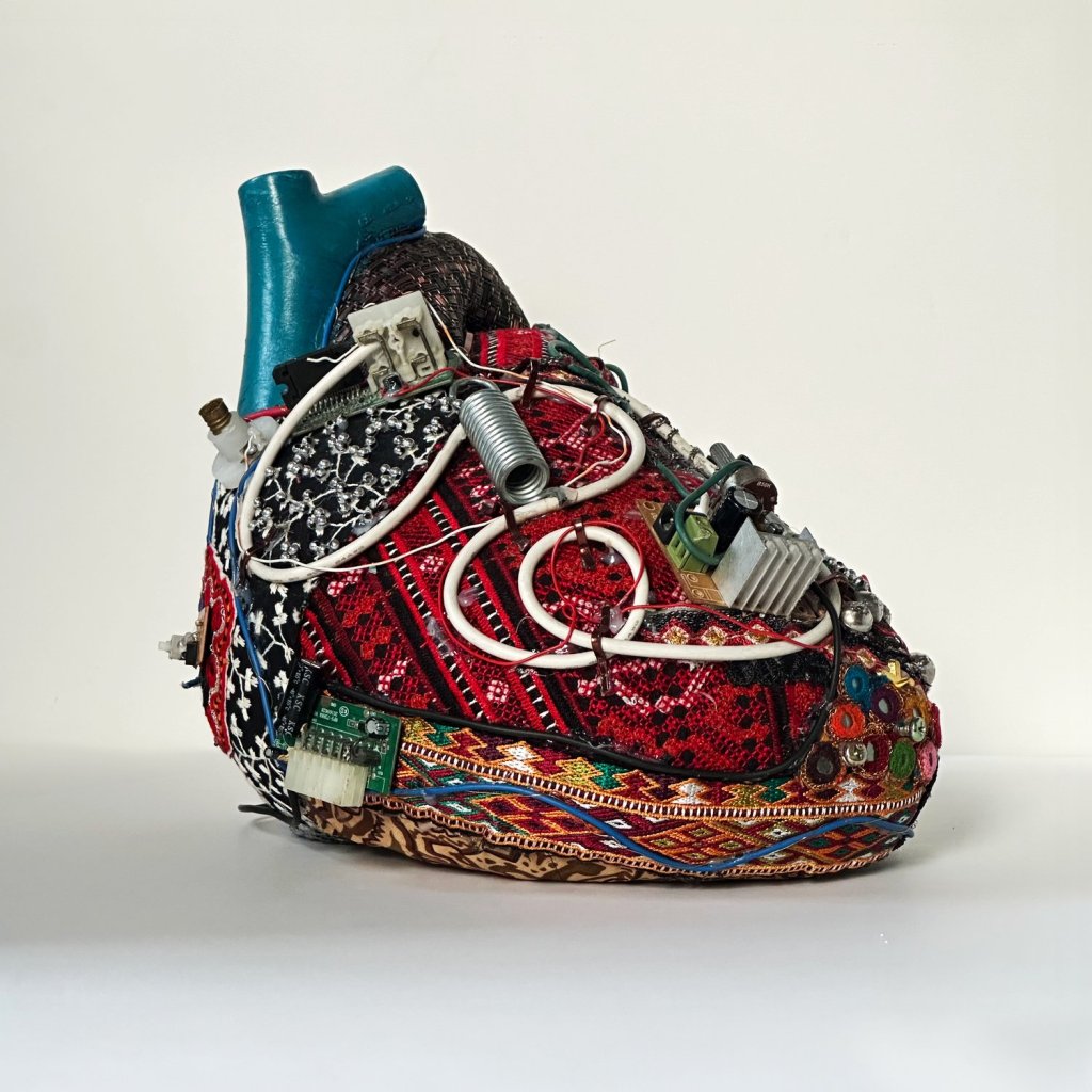 Saks Afridi creates sculptural hybrids that blur the line between memory, technology, and ancestral tradition. he weaves cultural symbolism with speculative futures where love and identity live in both heart and machine.