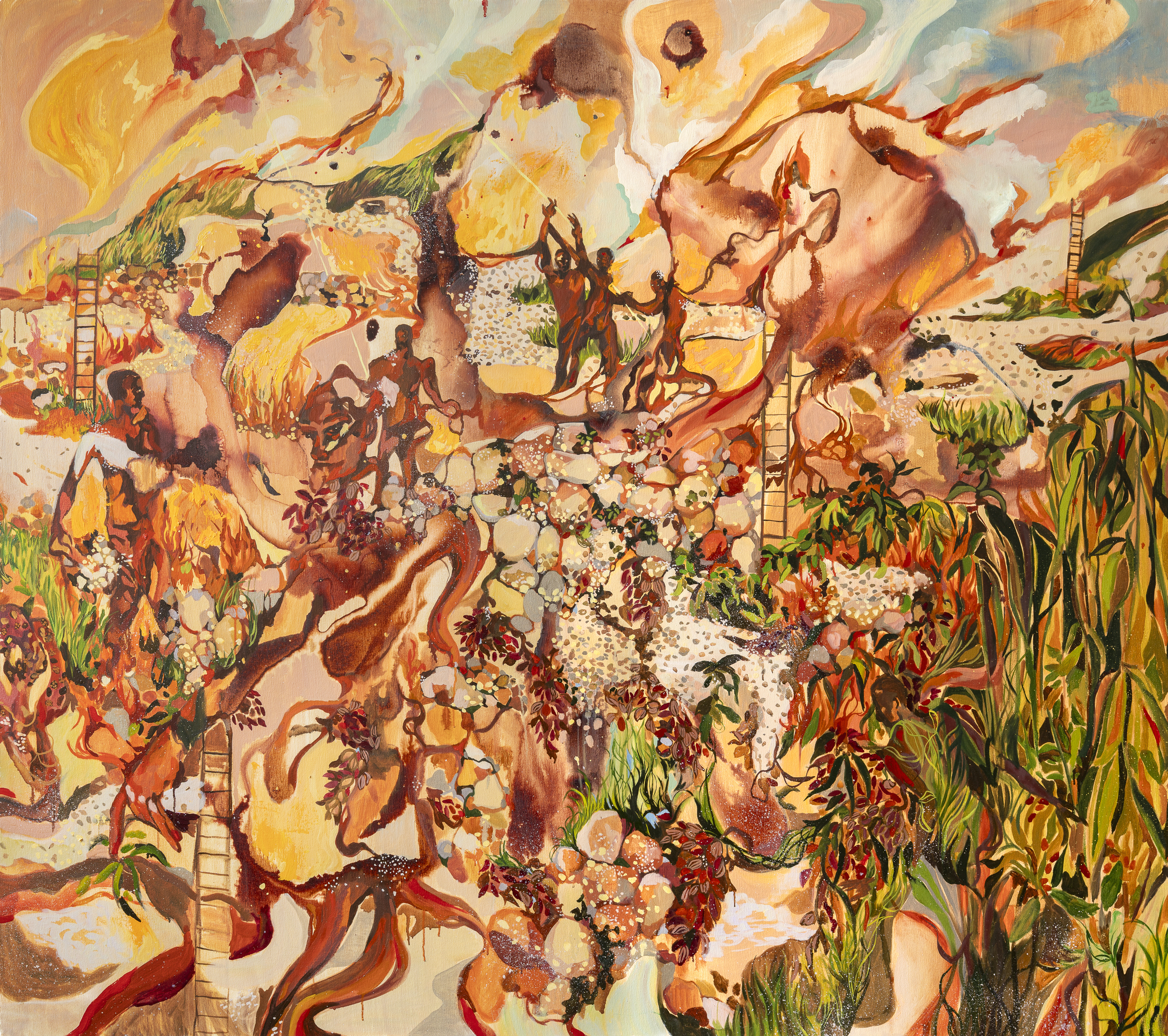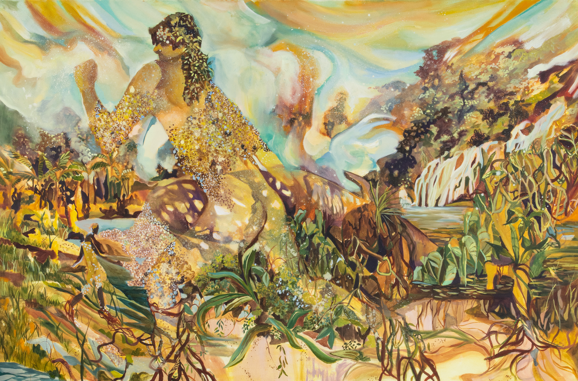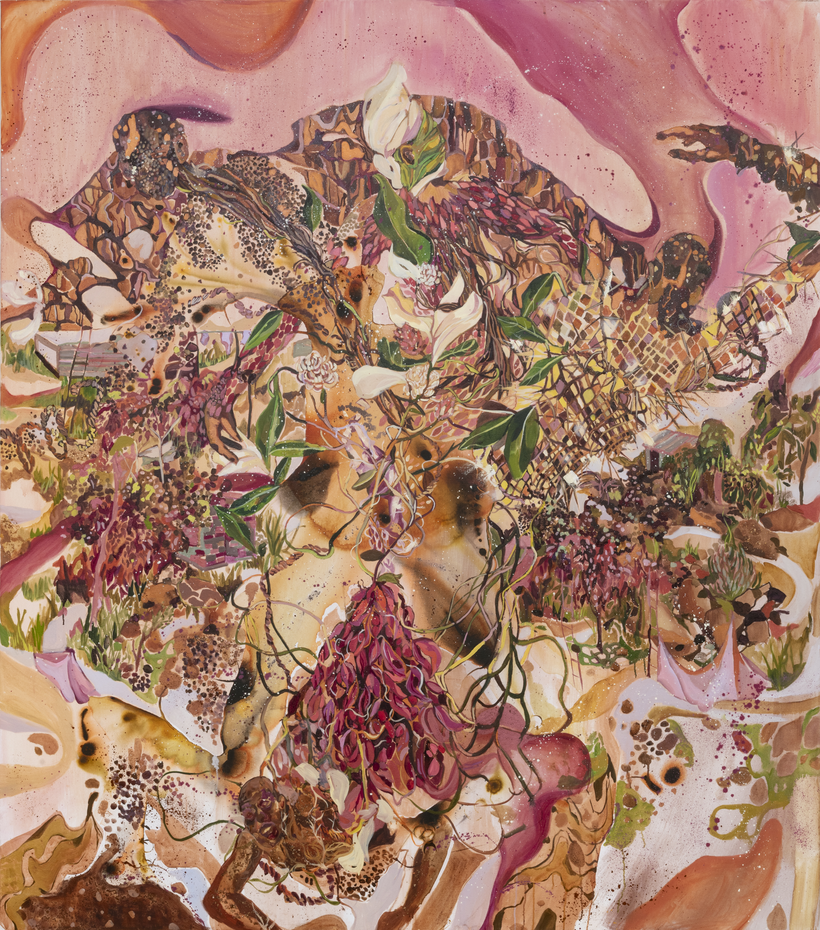Oil, ink, mica flakes, pigment and acrylic on canvas, 60 x 84 in.