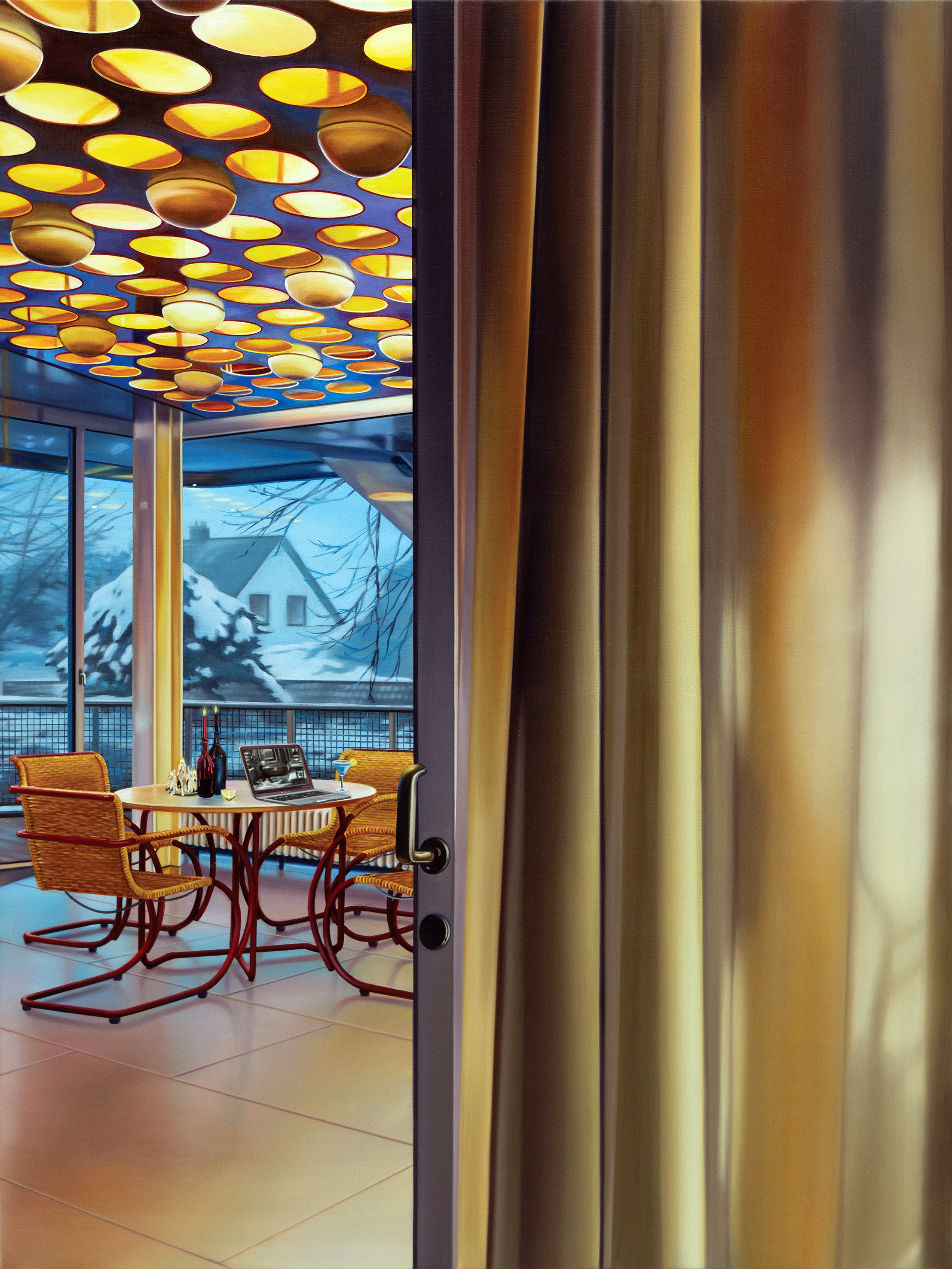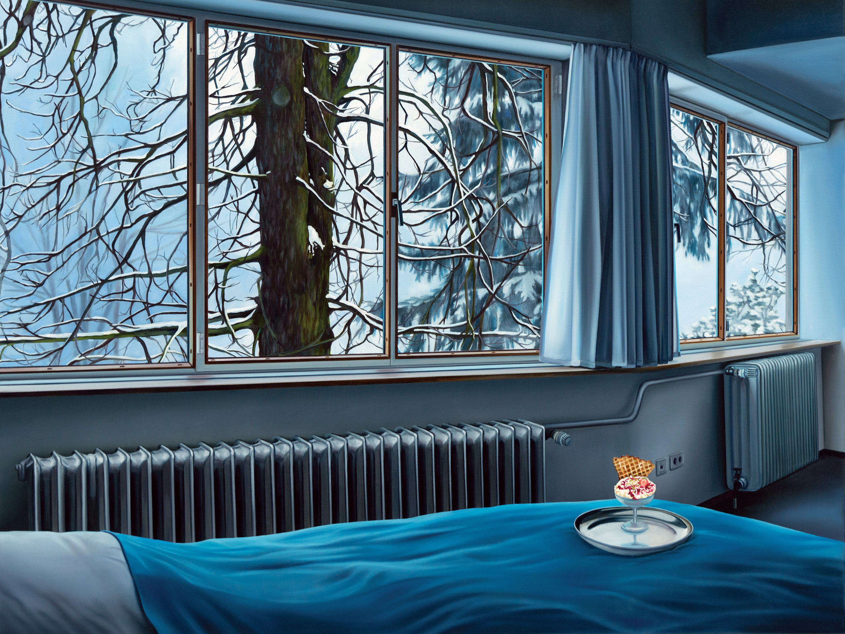 Alina Grasmann is a realist painter whose large-scale, site-specific series blur fact and fiction. Her works are inspired by her travels, American architecture, film, and literature. Each series contains about 10–15 paintings, all based on specific locations. Grasmann researches places and then visits them in real life, recording her experiences and the atmosphere through photographs.