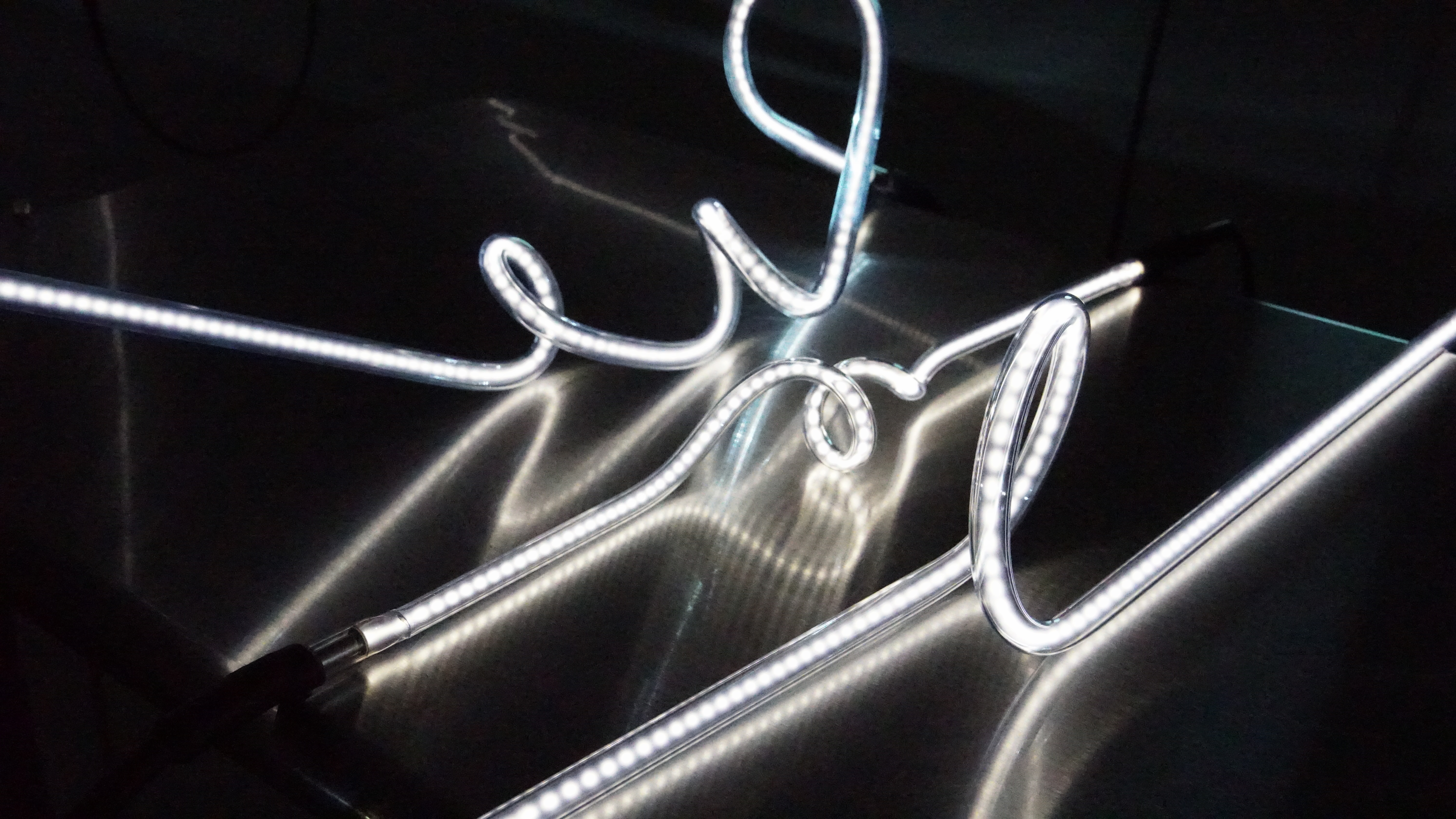 Bowery Prints is a suite of photograms made with glass objects the artist purchased from the last lighting stores that remain on the Bowery, and with the light the artist collected when photographing the shops’ interiors. Throughout the gallery, a series of neon sculptures bent and blown by the artist respond to light fixtures sold in the nearby shops.