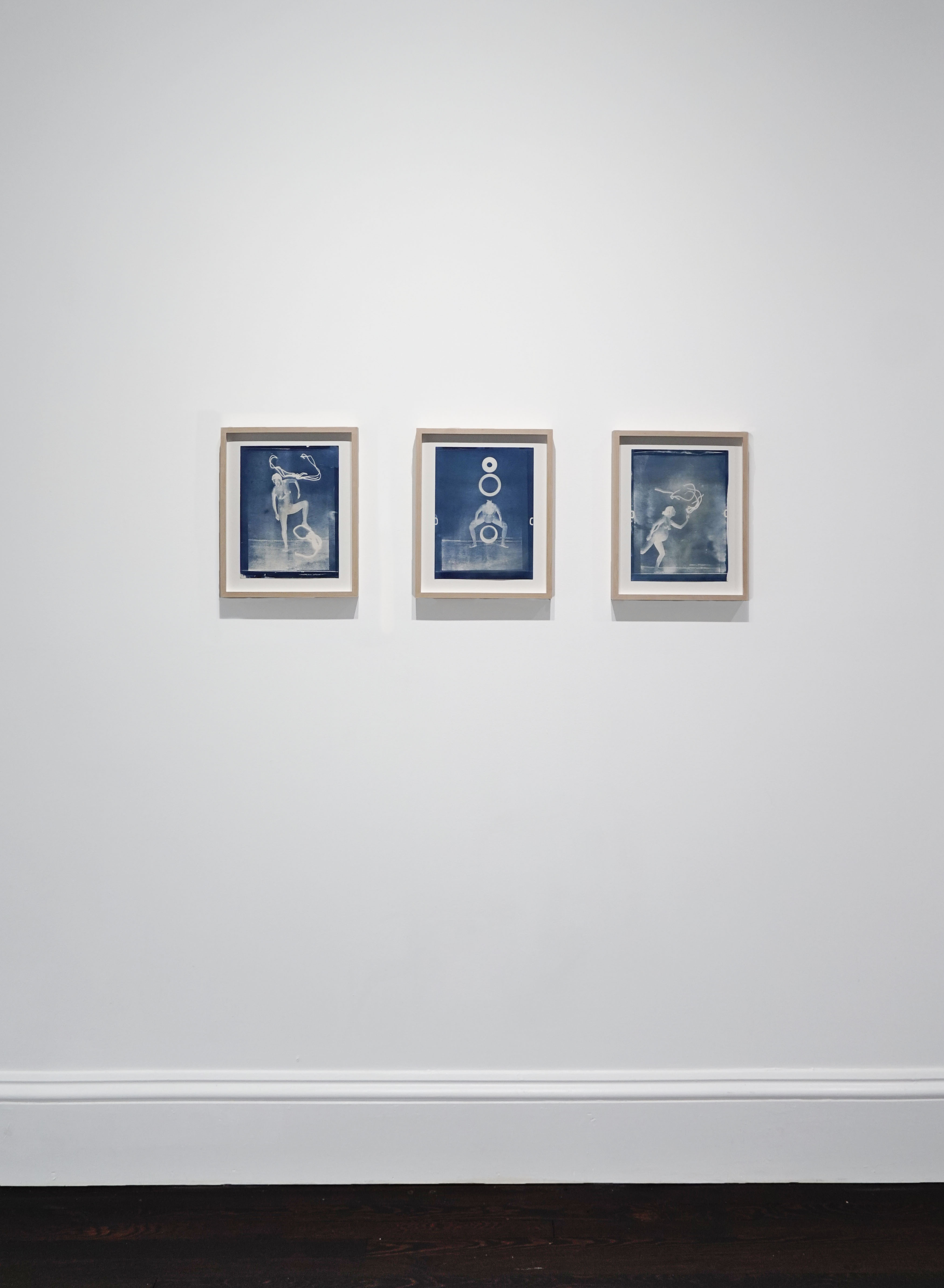 Gerardo Castro burns the outline of his body on paper, adding symbols and thin washes of indigo dye and paint, a powerful gesture of mind-body connection and transformation. In Shanti Grumbine’s cyanotypes, the artist’s pregnant body interacts with mysterious shapes, seemingly transmitted from a dimension where different laws of physics apply.