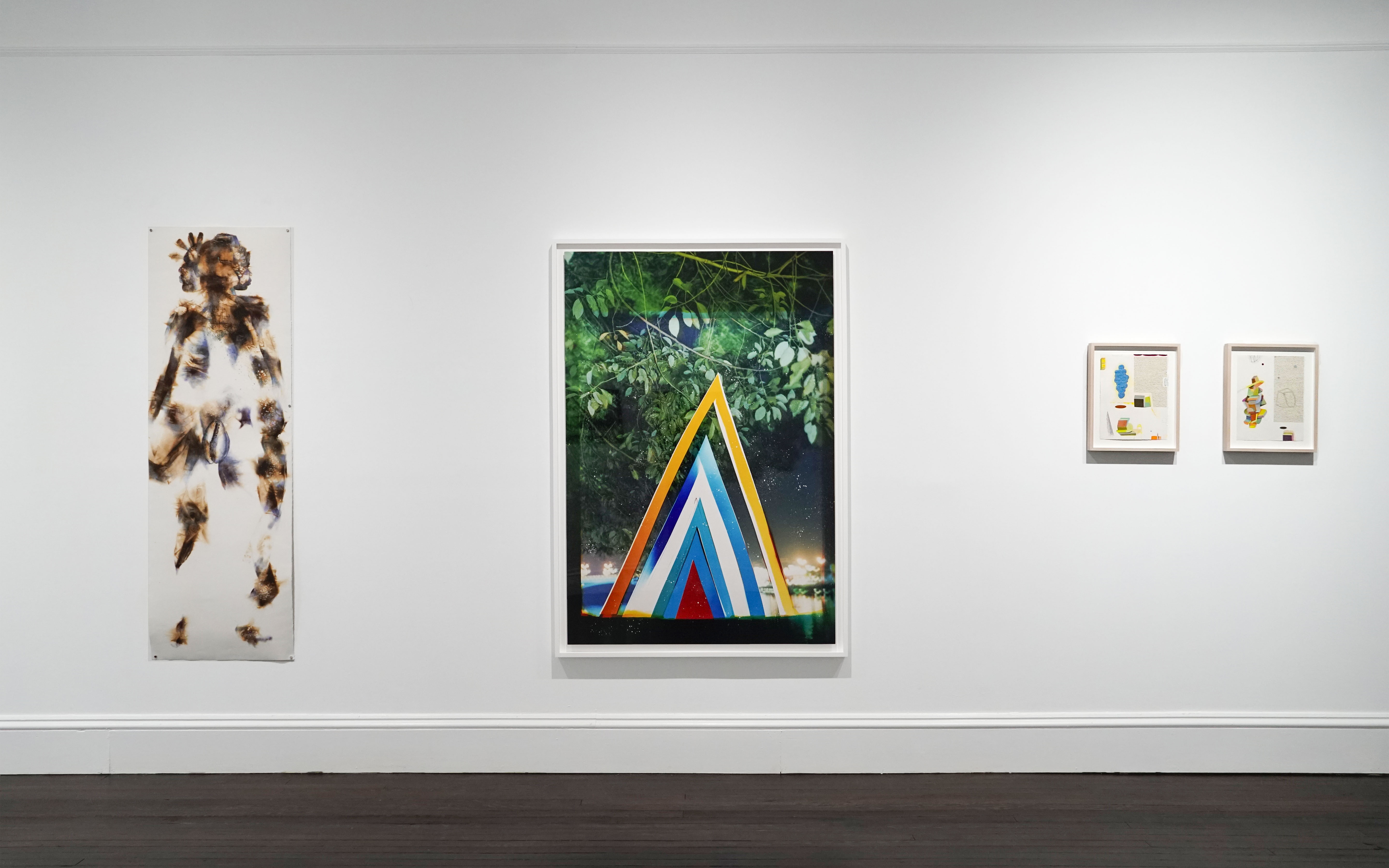 Liz Nielsen’s photogram, superimposing intensely colored triangles over a leafy forest, is a portal into sacred geometry, a landscape that is somewhere and nowhere at once. Mollie McKinley’s alchemic sculptures of glass, salt, and light are hybrids of the ancient and of the future, embracing the discomfort of our inability to comprehend the unknown. Millicent Young’s hanging installation made from grapevine and horsehair is a meditation on the capacity of materials to bear witness and embody memory, independently of our own.