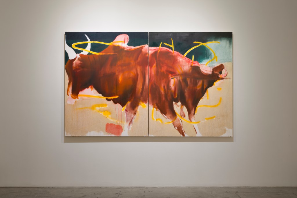 — Living between worlds: Alibaba Awrang’s calligraphy made on the U.S. military base in Qatar where his family escaped just as the Taliban conquered Afghanistan; Lesia Khomenko’s painting of blurry footage from a Kamikaze drone approaching a soldier hiding in the trees; Jerome Lagarrigue’s scenes of Parisian street protests; Aura Satz’s lenticular closeups of a bullet entering and exiting a surface, forcing the viewer to walk “between the bullet and the hole”.