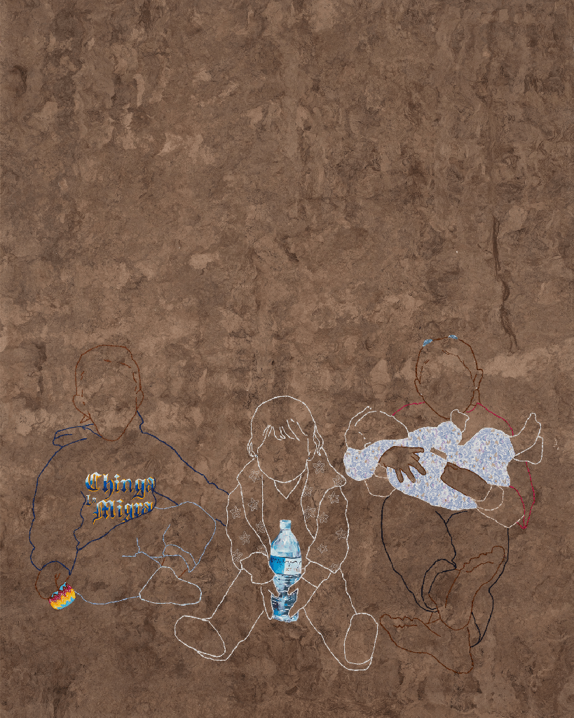 Many of Correa Valencia’s paintings show figures embracing, some fashioned from scraps of fabric, others fading into the background, their ghostly outlines stitched in thread. This duality between absence and presence illustrates the dominant fear and pain of separation pervasive in immigrant life, both when leaving the homeland and facing potential deportation in the host country. In Secuestrados / Abducted (2026), we see several figures clinging to their disappeared loved ones, raising the questions: How does a community survive when people are being kidnapped from the streets? How does a cultural memory persist? Here, Correa records and preserves history, creating a codex that encompasses a multigenerational experience of migration and alienation, her textiles representing the literal fabric of memory, pain, love, fear and joy that stitch a group of people together.