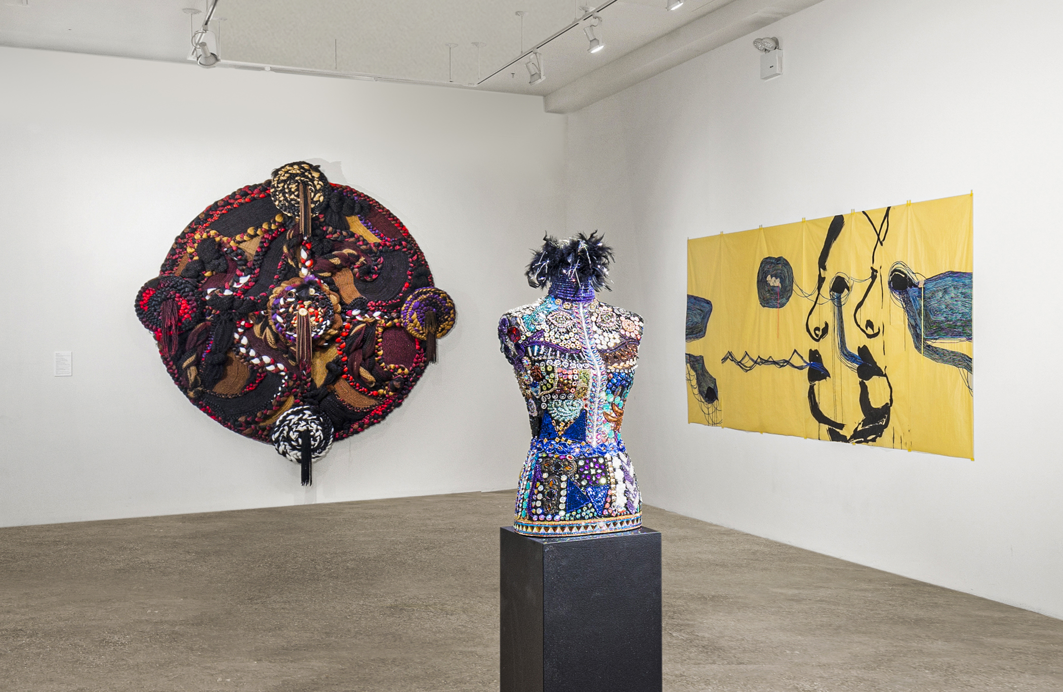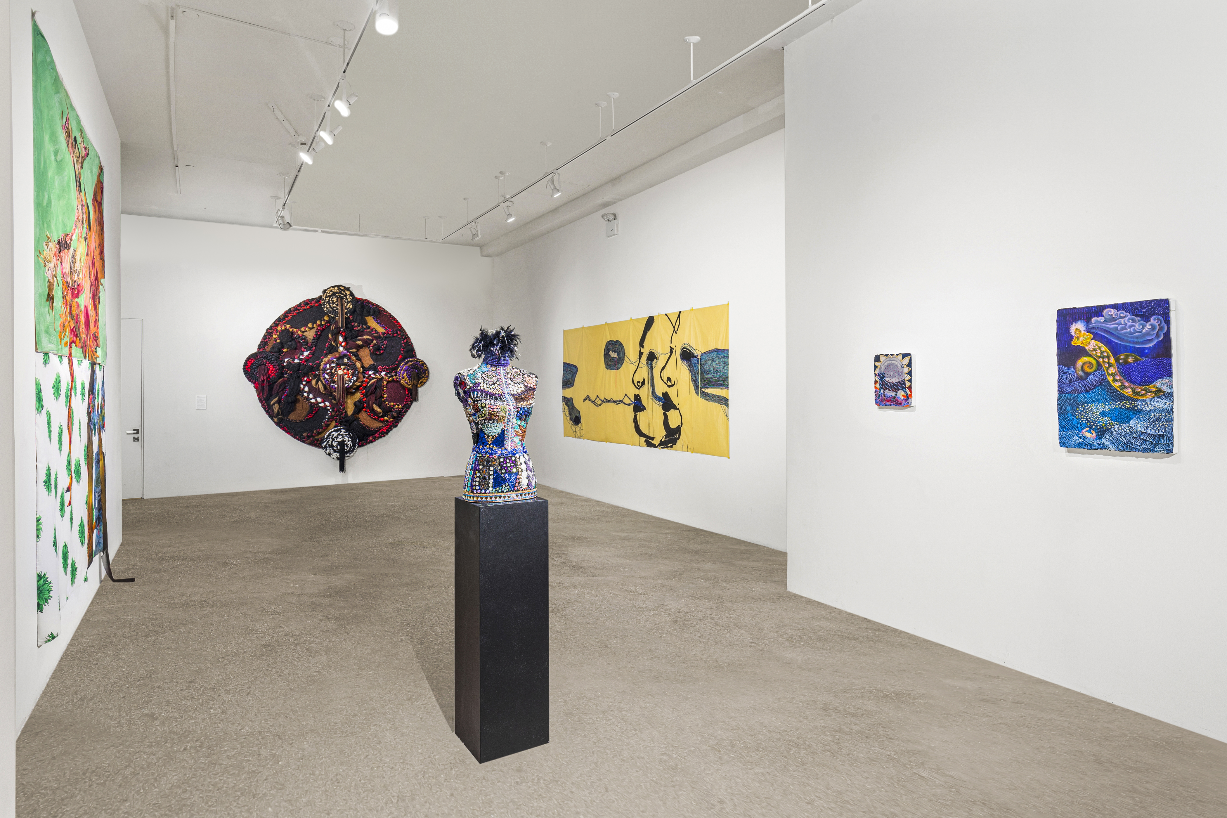 Ghalia Benali’s mixed-media drawings and genre-defying songs take inspiration from mystical Sufi poetry. Hana Yilma Godine’s paintings on floral chiffon fabrics feature divine female characters from ancient Abyssinian mythology. Dindga McCannon’s quilted sculpture bedazzles a classical bust with shimmering sequins.